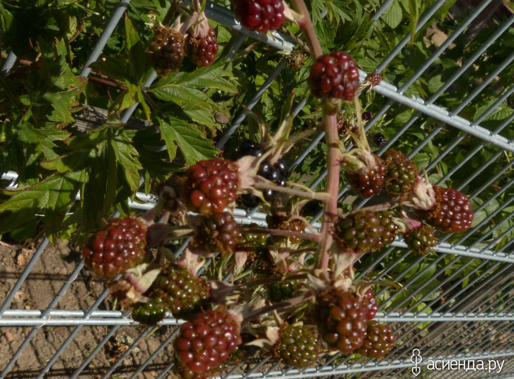 А если они убраны, то на ежевику нашу можно любоваться. Длинные ветви протягиваем вдоль забора в обе стороны от куста. К забору же и привязываем. Весной я удалила самые длинные побеги. Укоротила не очень длинные. Красота, конечно, когда вдоль всего забора ягоды растут. Но и куст пожалеть нужно. Тяжело ему приходится. Особенно в период, когда ягоды образовываются и наливаются.