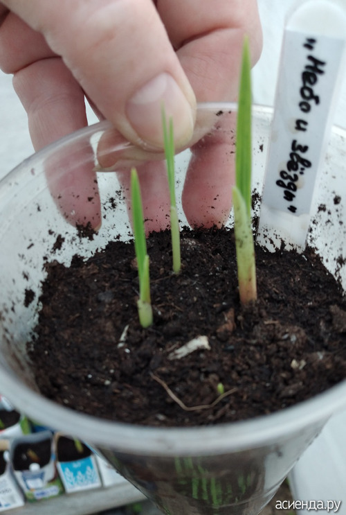 Когда появляются корни начинаю высаживать в горшки, банки, стаканчики в зависимости от размера луковицы.