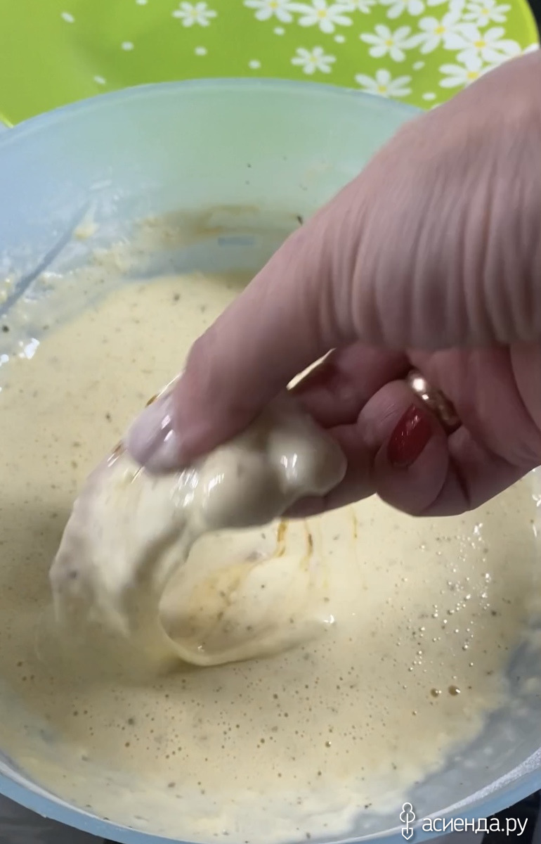 Пока филе насыщается соевым соусом, готовим кляр. Обычный кляр: яйца, мука, приправы.