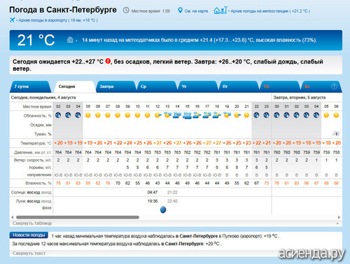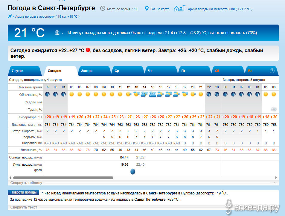 Температура воздуха ночью +15...+17 гр., на побережье Финского залива местами до +20 гр., днем +27...+29 гр.