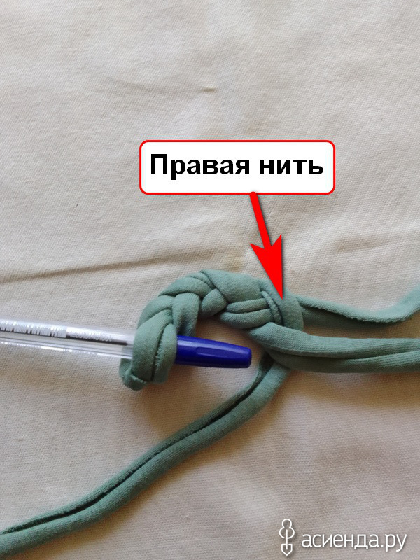 - Скручиваю косичку в круг и продеваю правую рабочую нить в начало плетения (отметила ручкой). Затягиваю в плотный кружок. Там где авторучка - должен быть указательный палец левой руки, а нить нужно продевать снизу указательным пальцем правой руки.