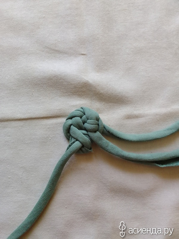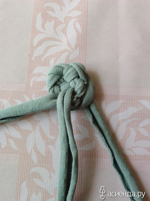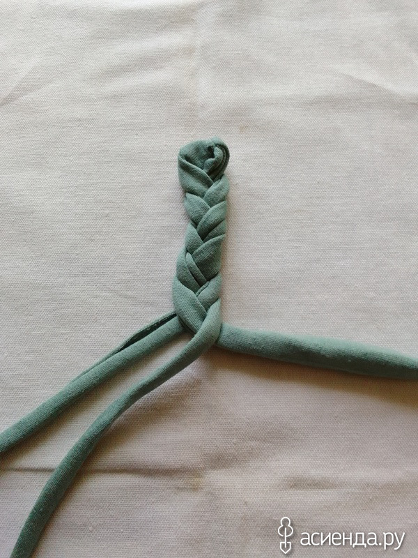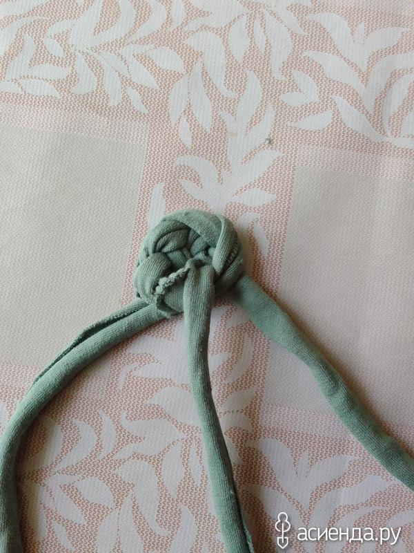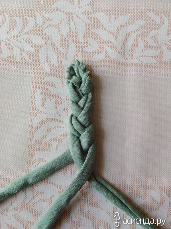 - Плету определённую длину, которую определяю методом "тыка", т. е. при скручивании косички в круг, чтобы не было дырки в середине. Именно для моих ниток это 4-5 переплетений.