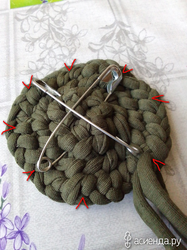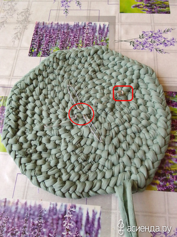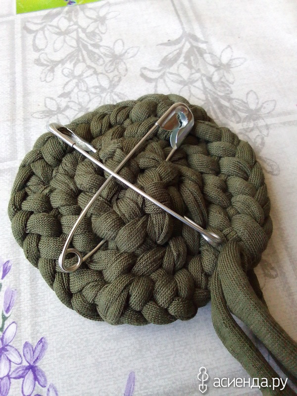 И чтобы не считать ряды (тем более они вяжутся по спирали) и удержать плоский круг (а он может пойти волнами или загнуться чашкой) я придумала способ облегчения плетения. А помощниками в этом деле выступят четыре обыкновенные булавки.