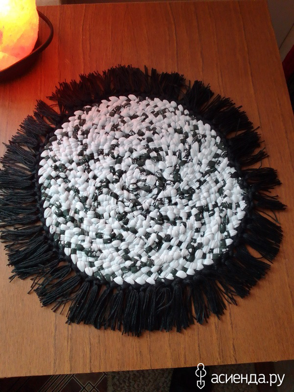 Это мои потуги плетения Чичковским методом (плетётся с помощью крючка). Дошла до плетения восемью нитками и поняла, что на большой коврик у меня просто не хватит нервов (про терпение молчу). Поэтому из того, что наплела, сделала салфетку... как раз под тяжёлый соляной светильник.