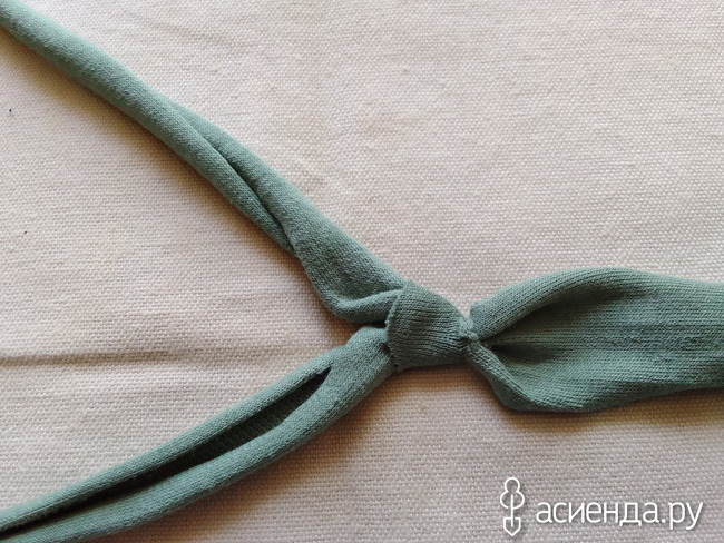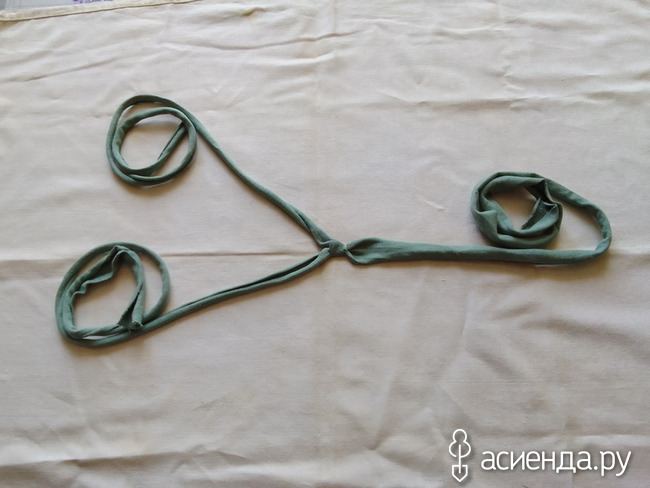 - Готовлю ещё одну нитку длиной один метр, делаю на конце прорезь и вставляю эту нитку в предыдущую прорезь. Продеваю хвост метровой нити в свою прорезь, замыкая в кольцо и затягиваю, т. е. таким способом соединяю нити, чтобы начать плести косичку.
