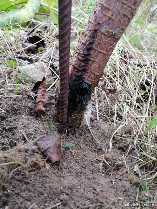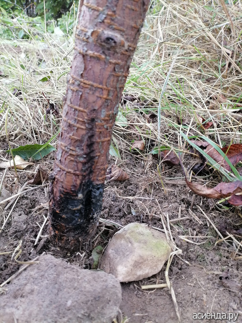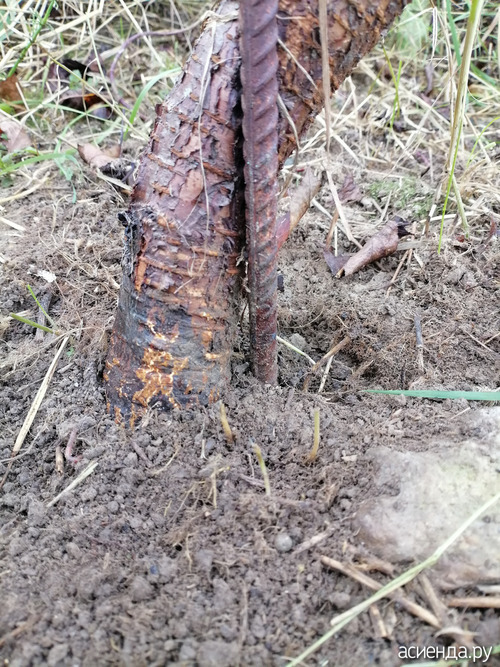 Вот что получилось. Черное в борозде на коре - это смола вишнёвая. Она как резина. Под смолой, вроде, кора цела. Ещё на этом стволе перетяжка от пакета, которым в детстве привязан был. Почему-то пакет сохранял прочность все эти годы