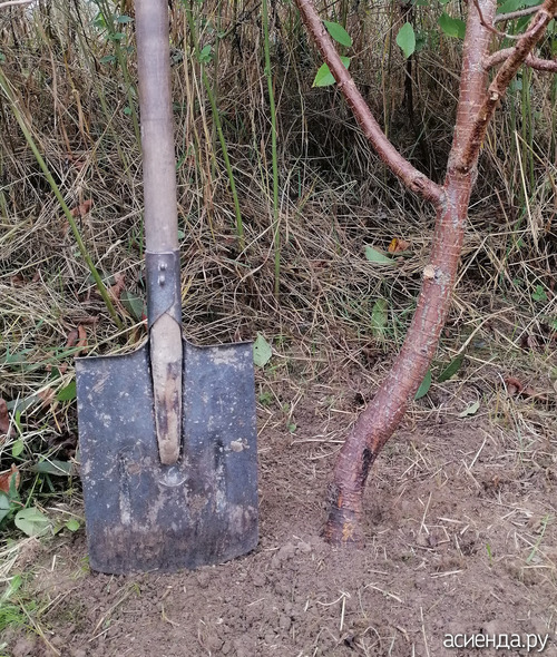 Начала с того ствола, который немножко помялся. Отогнула арматурину. Вставила между ней и стволом алюминиевую пластину, обёрнутую многими слоями полиэтилена. Смотрю, вдоль арматурины в грунте образовался канал в том месте, где она была до отгибания (такой у нас грунт