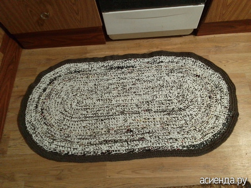 Я недавно связала крючком овальный половик...для входной двери 1,5 метровый. Тяжёленький, плотненький...намучилась с ним, так как вязала из трикотажной ткани + акриловая нитка в два сложения, крючок №10. Довязывала на столе, так как на коленях не могла удержать