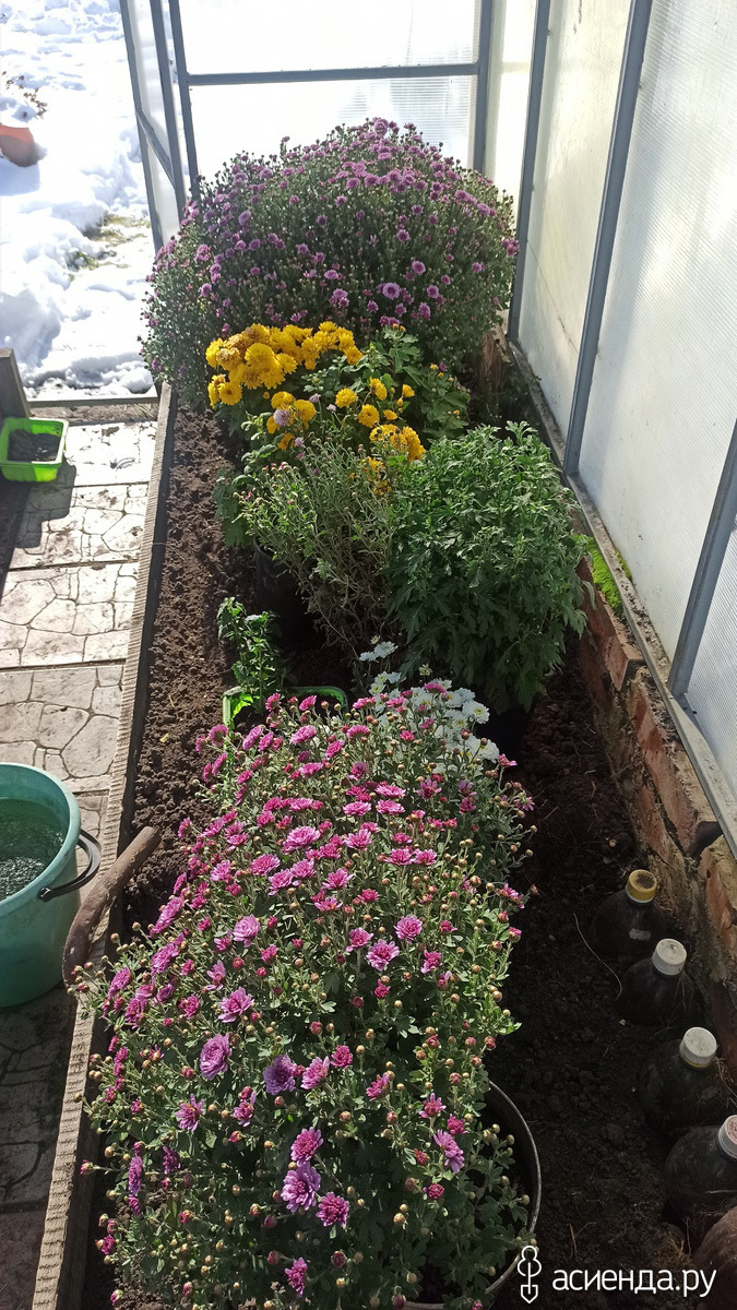 Часть хризантем до снега занесла в теплицу, пока цветут