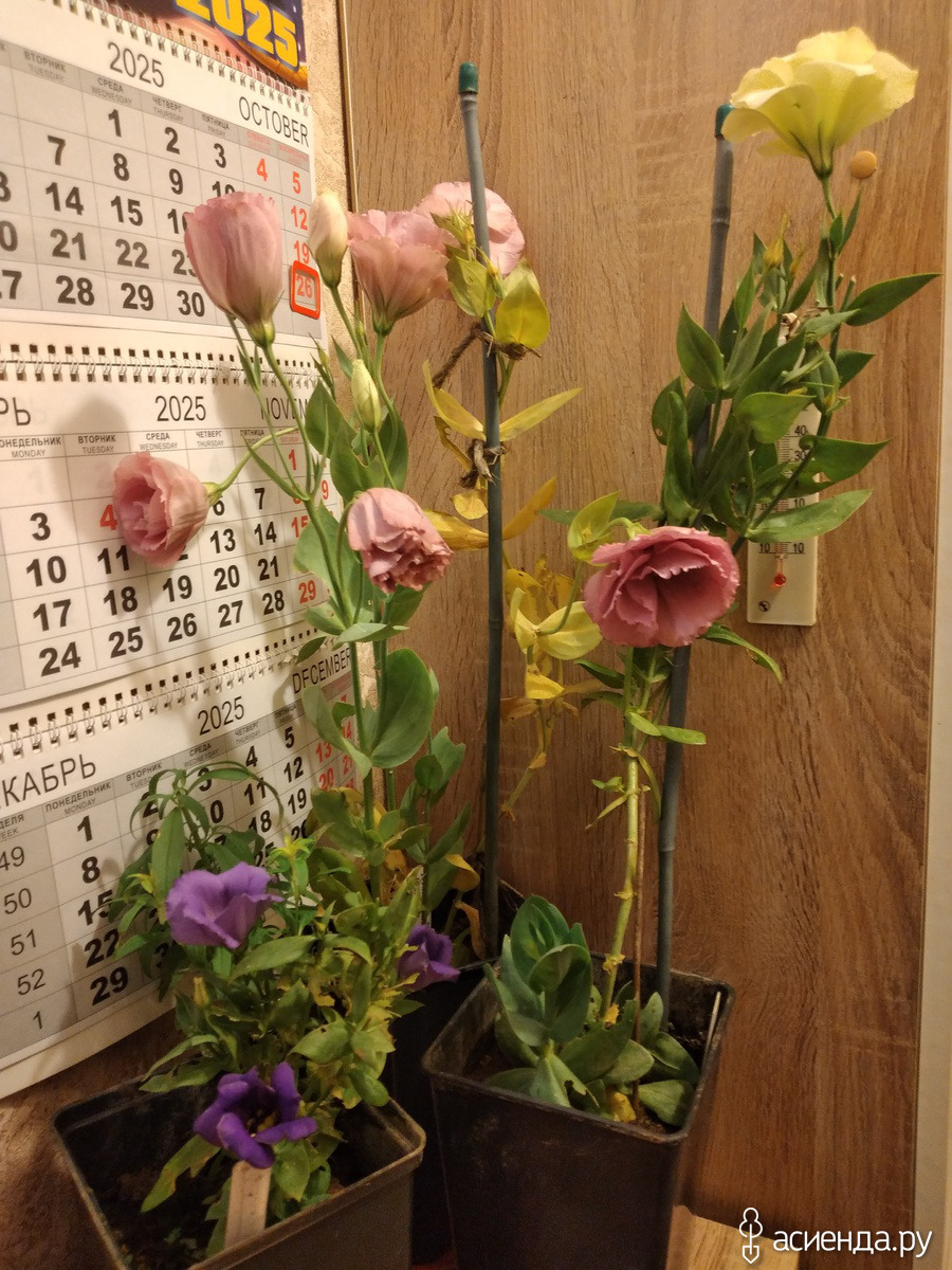 Забрала домой доцветать эустомы. Поздно они у меня в этом сезоне расцвели, уже совсем холодно, так что почти месяц любовалась на них дома.