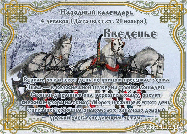 - Если снег после Введения не растаял - жди хорошего урожая хлеба.