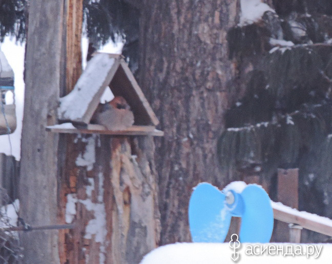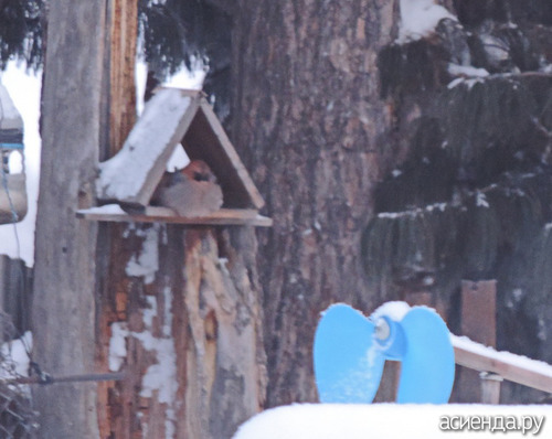 Утром выглянула в окно, а на кормушке сидит уже кто-то, думала белка. Глянула через объектив, а это сойка дремлет в кормушке. Вот какая бесцеремонная птица.