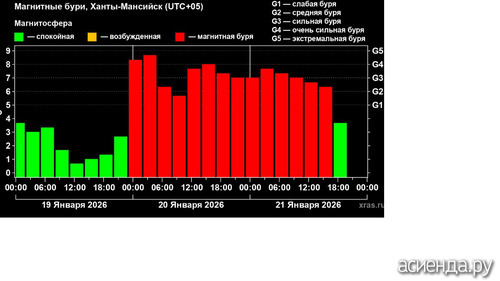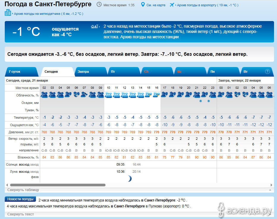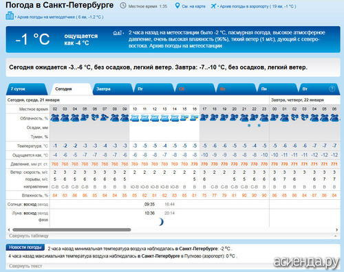 Сегодня днем ожидается переменная облачность, небольшой снег, местами дымка, -4..-6°, ветер слабый. Атмосферное давление в пределах нормы. Возможны небольшие геомагнитные возмущения. Вечером - небольшой снег, возможен туман. Ближайшей ночью переменная облачность, небольшой снег, местами дымка, температура -12..14°. Давление немного выше нормы. Возможны небольшие геомагнитные возмущения