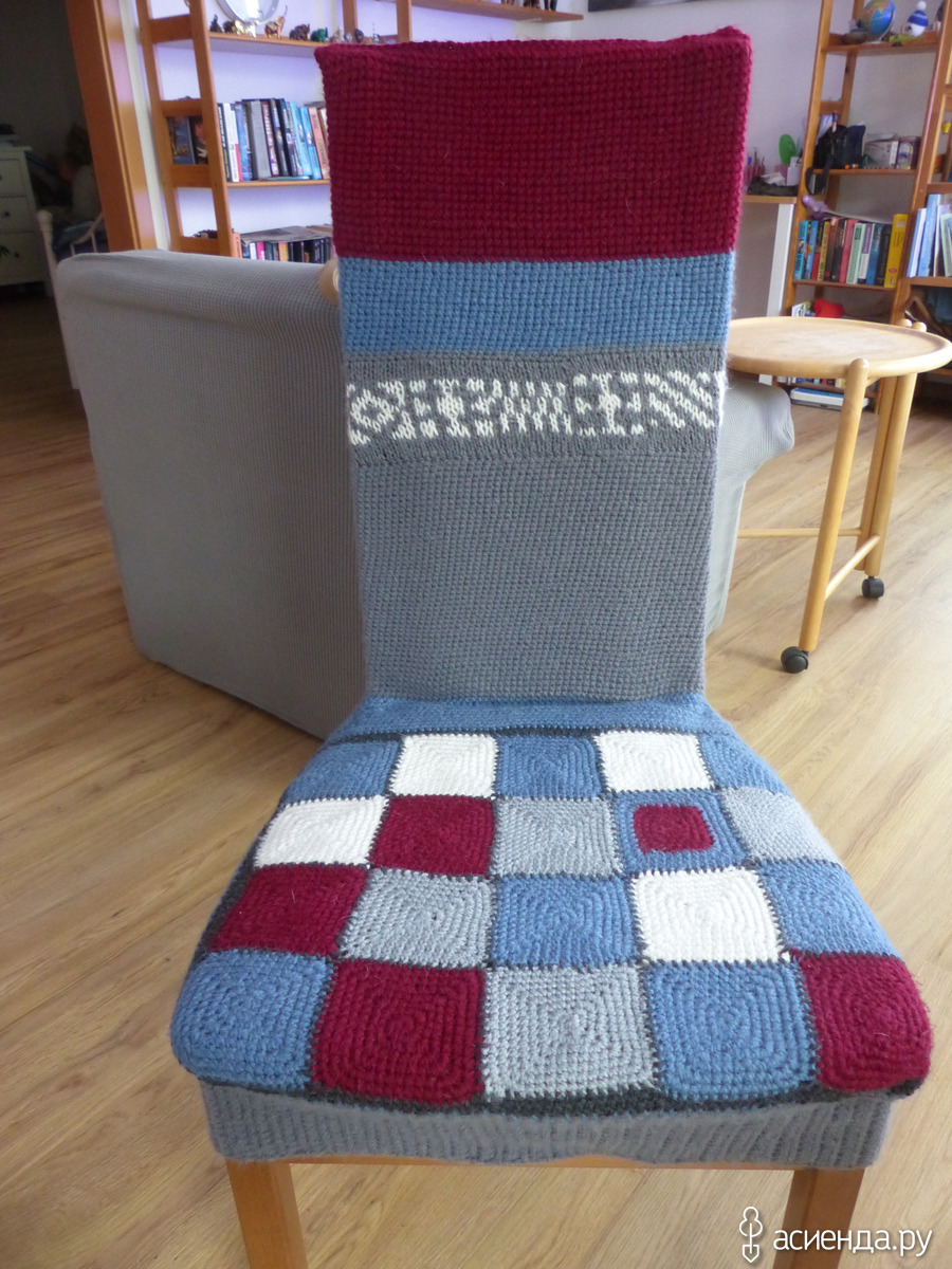 Чехол на стул однозначно получился самобытным и красивым...не поленилась связать манжетку
