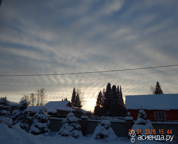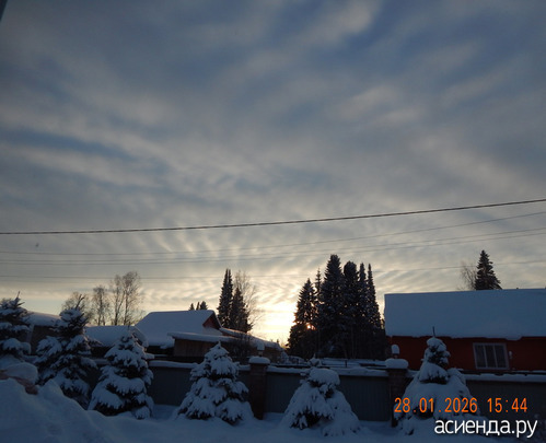 Сейчас (четыре часа) прогрелось до. - 13,7*, солнце садится в какие то интересные облака. Больше на протекторы от шин похожи. А может на рыбьи скелеты?