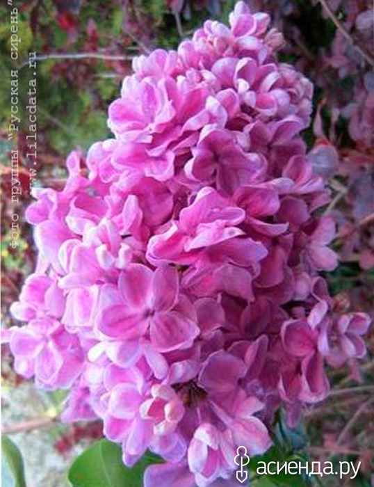 Сирень "Звезда Москвы" Сорт среднего срока цветения с крупными, плотными, широкопирамидальными соцветиями. Взрослые растения достигают высоты около 2-2,5 м. Соцветия достигают 28 см. Цветки полумахровые с изогнутыми лепестками пурпурного цвета. При распускании цвет меняется на более светлые тона. Зона 3 (до -34? С). Даже фото найти задача еще та, но в паре мест можно и купить.