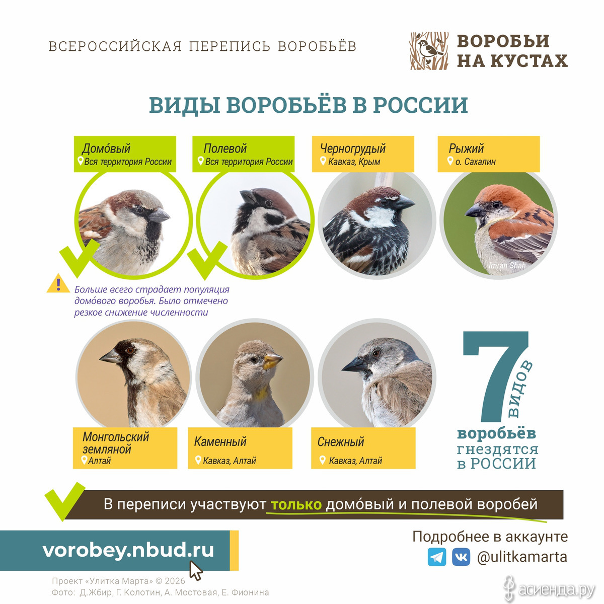 Мама, кстати последние годы жила с Женей и зимой на его даче, кормила там воробьев. Скармливала по 8 кг семечек в месяц. В переписи не принимала участие, ей их считать было тяжело т. к. надо определить вид и сделать фото/видео подтверждение. А задача посчитать и определит вид и с городскими воробьями не простая, а уж с деревенскими, да с "забором" из туй рядом совсем трудная. Зимой еще куда не шло - можно понять домовой или полевой по самкам - нет самок значит полевые тут, а вот если есть самки, то надо всматриваться в самцов и смотреть есть ли полевые среди домовых. Без зоркого глаза или хорошей камеры никак. А летом еще молодняк с толку сбивает. Зато теперь я знаю разницу между полевым и домовым воробьем)