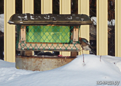 Вот сойка ломится в кормушку, а она сеткой от крупных птиц закрыта. Маленькие пролезают без труда, а у сойки только голова просовывается.