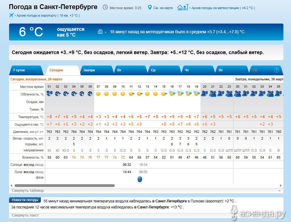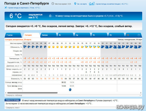 Температура воздуха ночью 0...+2 гр., в окрестностях до -2 гр., днём +12...+14 гр., на побережье Финского залива местами до +8 гр.