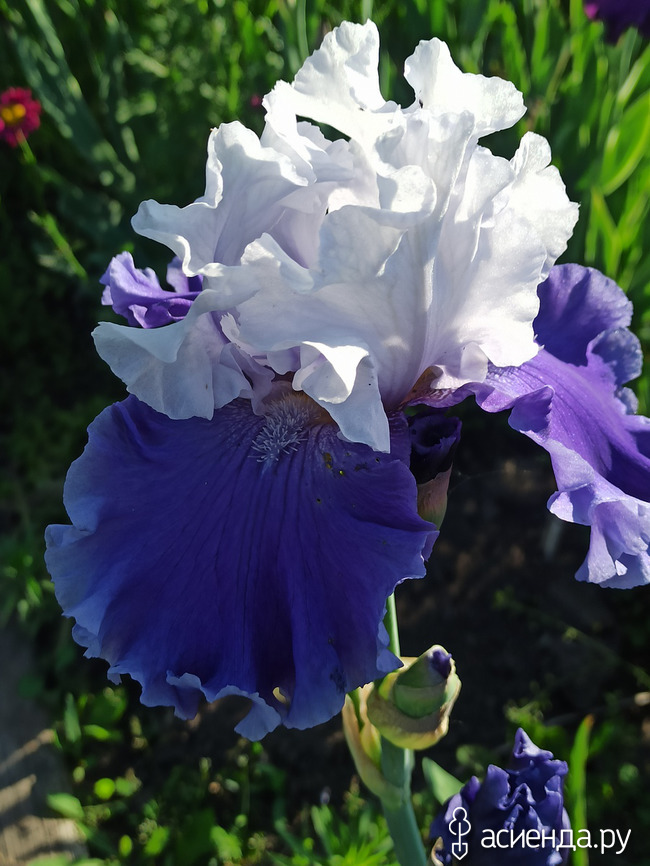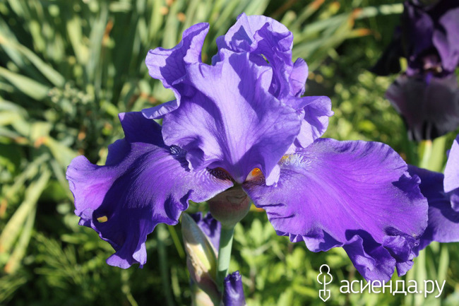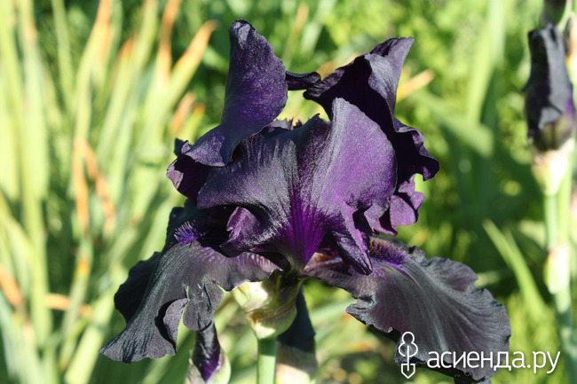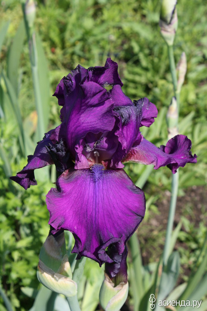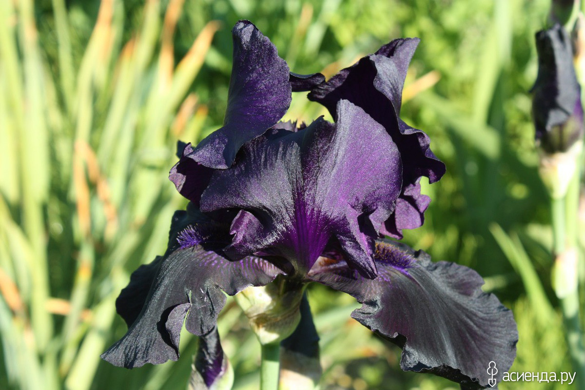 Величественный чернильно-фиолетовый бородатый ирис с гофрированными лепестками по краю с идеальной формой, атласным отливом. На каждом высоком (до 90 см) цветоносе располагается по 7-11 бутонов. Бородка неоново-синяя. В начале роспуска и в пасмурную погоду преобладают чернильные оттенки. На солнце начинается игра света, появляется много фиолетовых бликов. Потрясающее зрелище, преображающее цветок до неузнаваемости! Период цветения средний – июнь-июль.