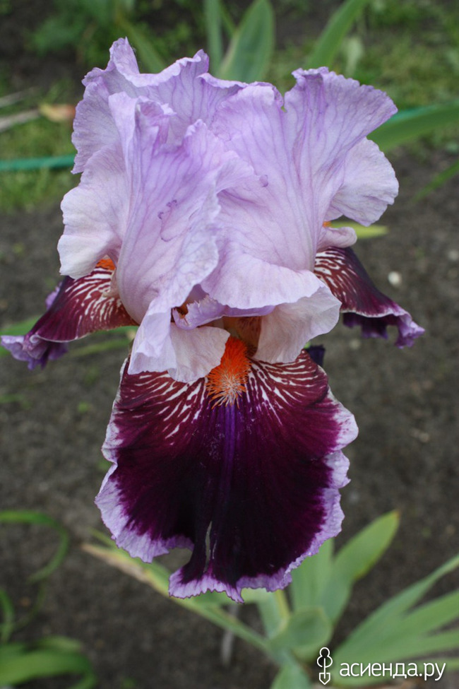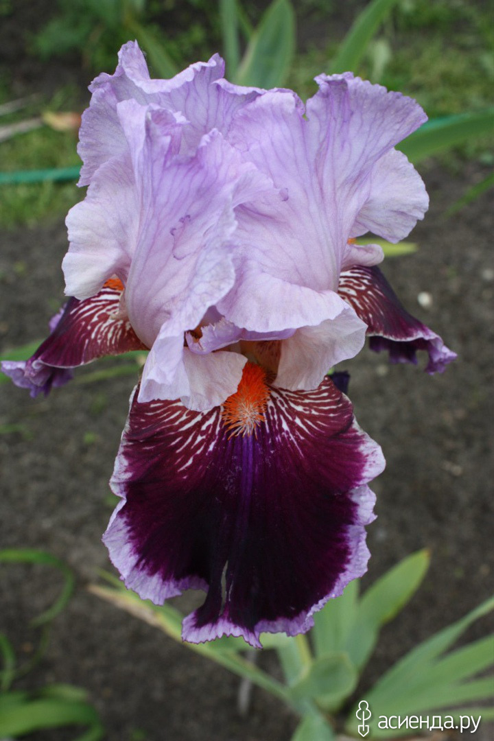 Германский бородатый представитель с веерными мечевидными листьями, покрытыми лёгким сероватым восковым налётом. Оригинальное сочетание белого и тёмно-сиреневого оттенков на лепестках этого сорта, делает его неповторимым по красоте растением на клумбе. Широкая тёмно-сиреневая кайма на белом фоне дополнена короткими штрихами. Светло-сиреневая бородка к центру переходит в жёлтую окраску. Цветы очень похожи на парящие орхидеи. Цветение продолжительное с конца мая до начала июля.
