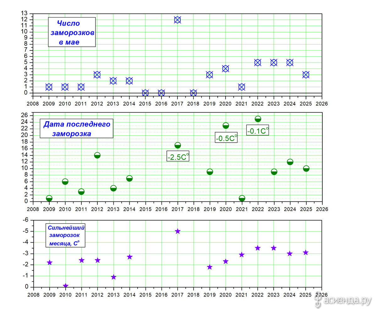 2) 2021 г., 2022 г. и 2025 г ограничились двумя датами мая. Самая морозная ночь (-2 град) была 5 мая 2022 г. и 2 мая 2025 г.