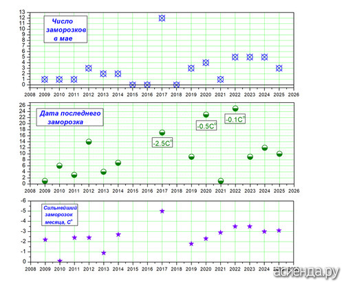 Видно, что в последние годы в мае было 3-5 заморозков. И это в среднем поболее, чем в первой половине периода наблюдений, в конце нулевых и в начале десятых годов.