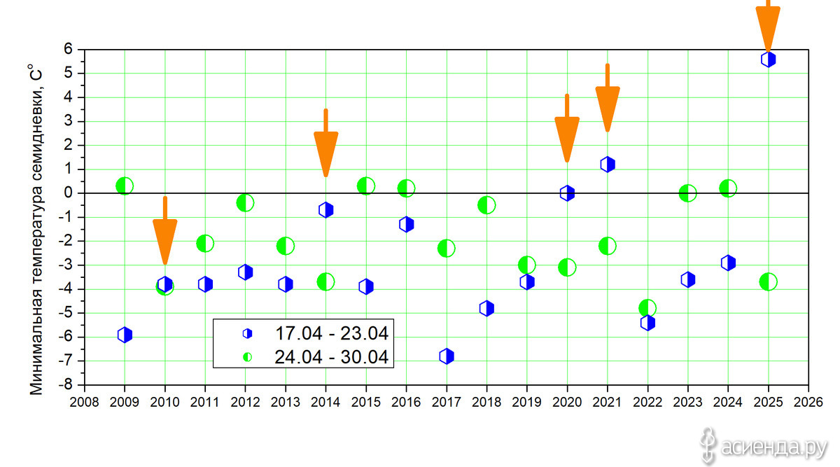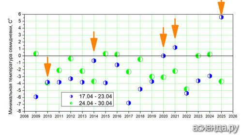 Чтобы не поддаваться на провокации неустойчивой апрельской погоды, я продолжила анализировать соотношение минимальных температур в последней и предпоследней семидневках апреля.