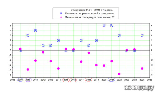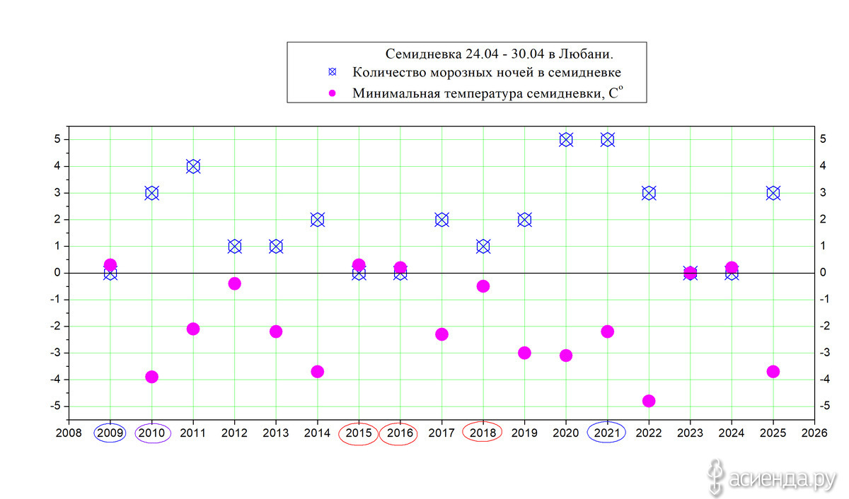 (кружками обведены годы, когда наблюдались безморозные и почти безморозные