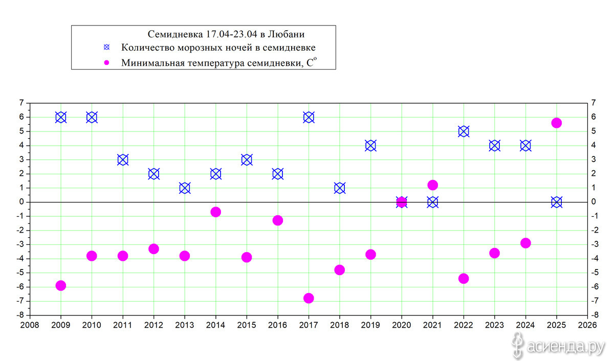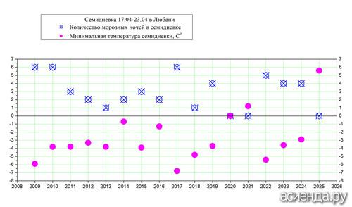 Тут ничего особенного не добавилось. В 2023 и 2024 годах последняя семидневка апреля была безморозная, но безморозного мая после этого не случилось. Это свидетельствует против моей гипотезы, что безморозный май можно предсказать по безморозной последней семидневке апреля. В 2022 году был побит многолетний рекорд (с 2009 года) по силе мороза в последней апрельской семидневке. Там случилось -4.8С (до этого не бывало морознее -3.9С).