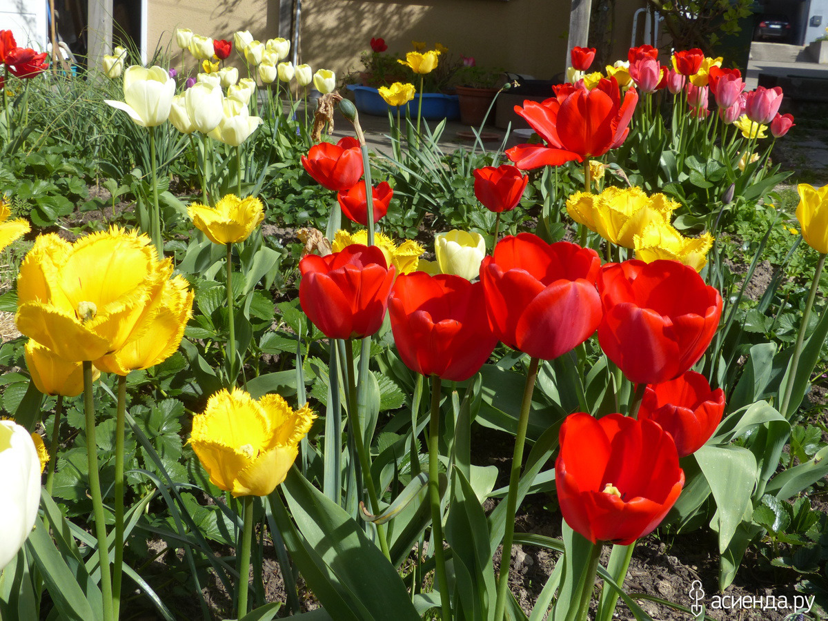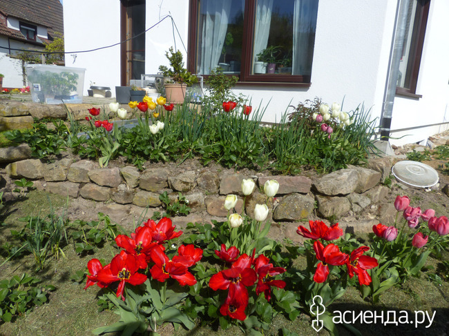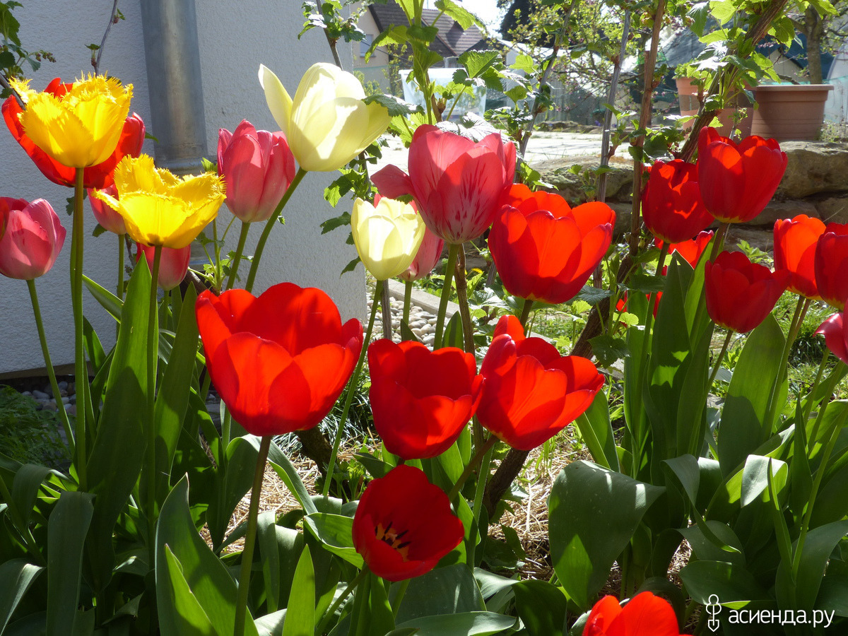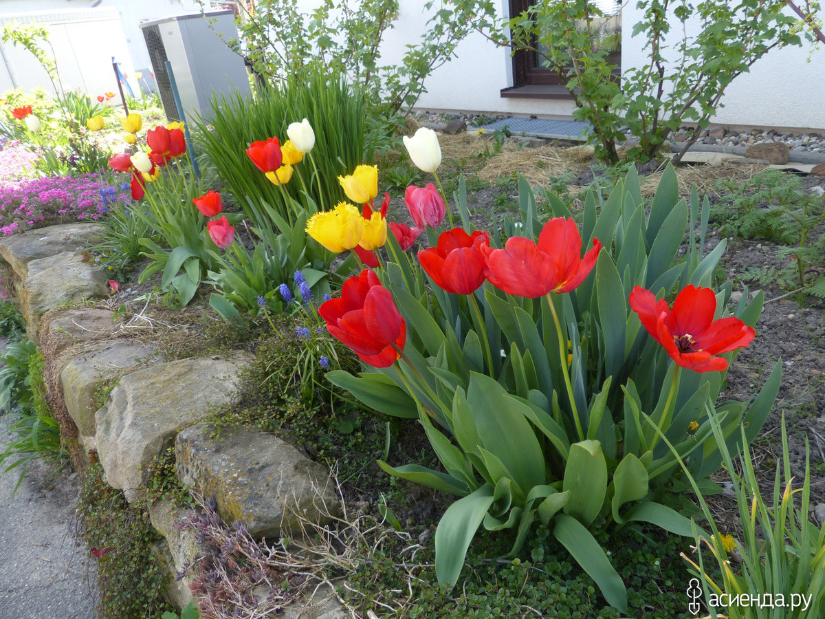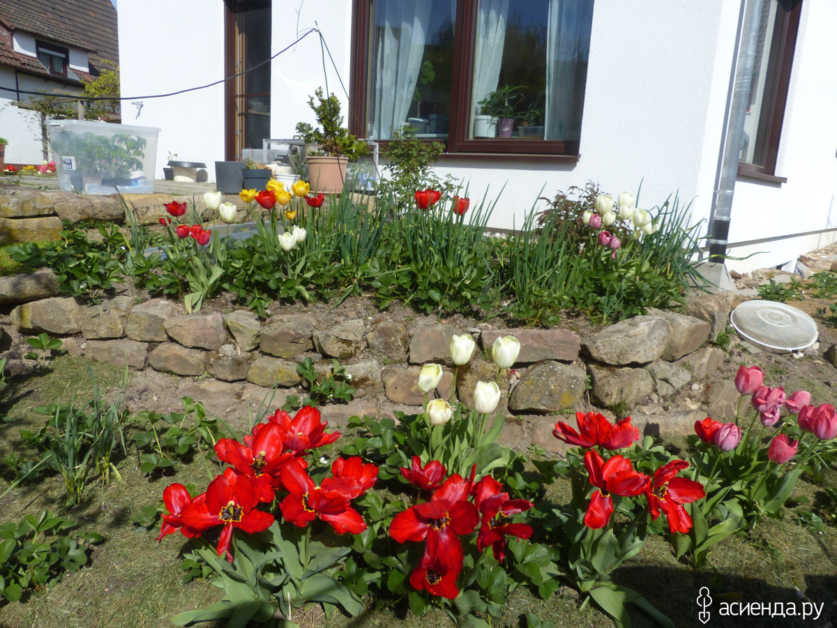 Красиво у тебя во дворе...солнечно, цветно. У меня тоже тюльпаны некоторые распускаются, другие осыпаются. Сегодня дождик тихий хороший, поливочный для земли. Днём тепло, ночью до +3 опускается температура.