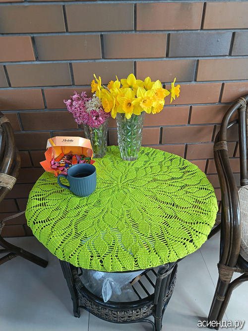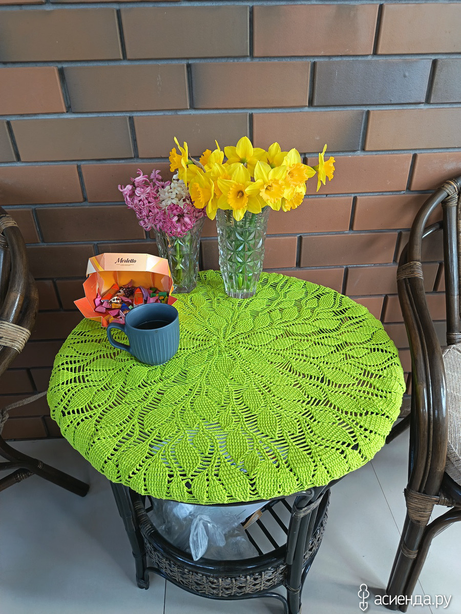 Она и не совсем скатерть, по кругу стола чуть свисает. Смотрится как чехол на круглом столе.