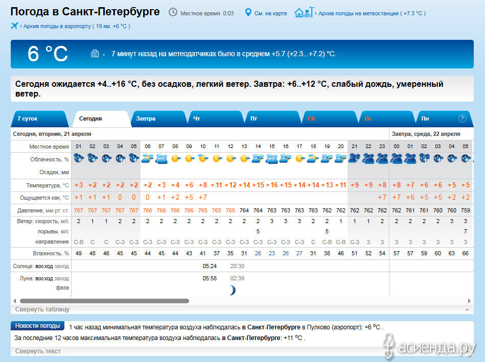 Температура воздуха ночью +1...+3 гр., местами до -2 гр, днём +12...+14 гр., на побережье Финского залива местами до +9 гр.