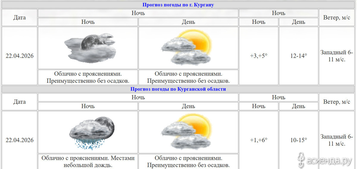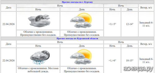 Сегодня, 22 апреля, в Кургане днём температура воздуха будет от +12 до +14 градусов. Синоптики осадков не прогнозируют. Но они есть