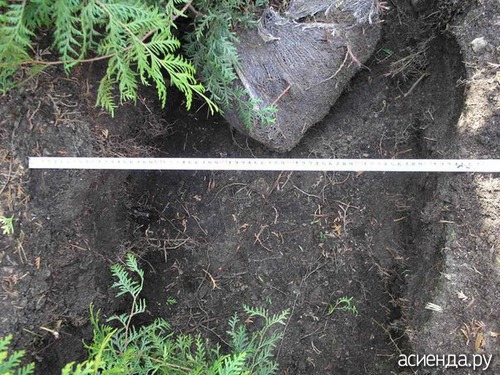 Сажаем тую в траншею, засыпает грунтом, утрамбовывает, заливаем водой. Пускай стоит впитывается. Через какое-то время снова подсыпаем грунтом и заливаем водой. И так до тех пор пока грунт полностью не утрамбуется. Позже для декорации посадок можно использовать кору для хвойных пород.