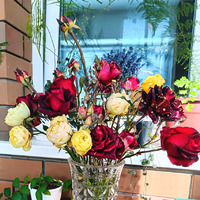 Вот и добралась я до роз, может и рановато обрезала, на следующей неделе дожди стоят беспросветные по прогнозу, а сегодня и погода ветерок и солнышко-быстро срезы подсушит. Набрала много красоты, жалко было резать, очень много бутонов ещё маленьких. Зато теперь я поняла, что мне на День Рождения пожалуй стоит просить вазы. Разных и побольше Все эти букеты для вас, мои дорогие. Пусть в хмурые осенние денёчки в доме всегда будет светло, уютно и тепло